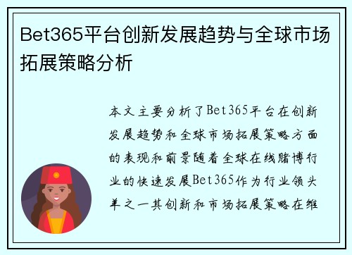 本文主要分析了Bet365平台在创新发展趋势和全球市场拓展策略方面的表现和前景。随着全球在线赌博行业的快速发展,Bet365作为行业领头羊之一,其创新和市场拓展策略在维持竞争力、扩大市场份额、提高用户粘性等方面发挥了重要作用。文章从四个方面详细探讨了Bet365如何通过技术创新、产品多样化、市场拓展及本地化策略应对竞争,并在全球市场上占据一席之地。首先,本文将分析Bet365在创新发展中的技术驱动;其次,探讨其产品和服务的多样化;接着,讨论Bet365的全球市场拓展策略;最后,总结Bet365未来发展的挑战与机会,为企业和行业提供一定的参考价值。