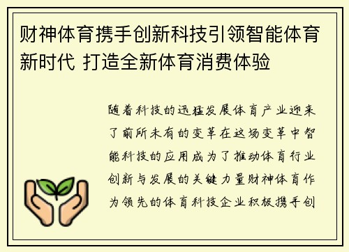 随着科技的迅猛发展,体育产业迎来了前所未有的变革。在这场变革中,智能科技的应用成为了推动体育行业创新与发展的关键力量。财神体育作为领先的体育科技企业,积极携手创新科技,推动智能体育的新时代。通过大数据、人工智能、虚拟现实等前沿技术的融合,财神体育不仅在提升竞技水平、丰富用户体验等方面发挥了重要作用,还为消费者打造了全新的体育消费体验。本文将从四个方面详细阐述财神体育如何通过创新科技引领智能体育的新时代,并推动体育消费的全面升级。