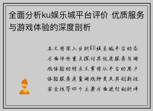 本文将深入分析KU娱乐城平台的各方面评价,重点探讨其优质服务与游戏体验的特点。文章将从平台的用户体验、服务质量、游戏种类及其创新性、安全性等四个主要方面进行剖析,详细讨论KU娱乐城平台为何能够在众多在线娱乐平台中脱颖而出。首先,我们将介绍KU娱乐城平台的整体印象,带领读者了解其吸引用户的主要因素。接着,文章将逐一解读平台在游戏体验、服务质量、创新性、安全性等方面的表现,分析这些特点如何提高平台的用户粘性并吸引更多新玩家。最后,本文将对KU娱乐城平台的整体表现进行总结,展望其未来发展潜力。
